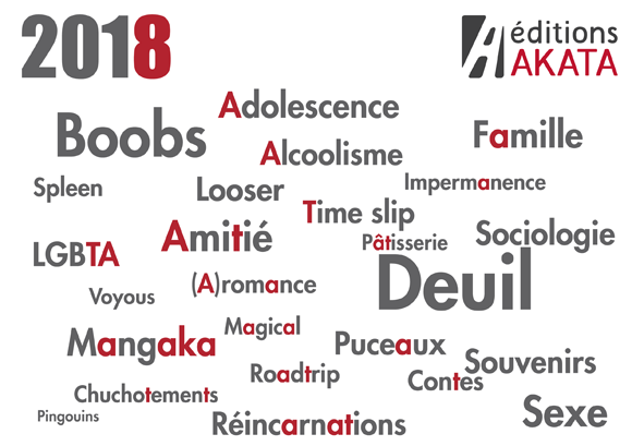 Nous profitons de ce début d'année pour, comme la tradition l'exige, vous souhaiter le meilleur, à vous et vos proches, pour les mois qui viennent ! Une fois encore, nous tenons à remercier tous ceux qui nous soutiennent, et qui participent de près ou de loin au succès d'Akata : les lecteurs, les collaborateurs, les libraires, les journalistes, les commerciaux… Tous ceux qui sont sur le devant de la scène, mais aussi dans l'ombre. MERCI ! Difficile de croire, pour notre petite équipe, que 2018 marque déjà notre cinquième année en tant qu'éditeur indépendant !!