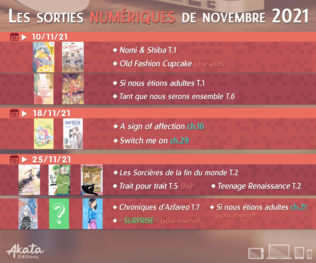 Nos premières nouveautés du mois sont disponibles en librairies ! Et cela signe la même chose pour nos publications numériques. On vous dévoile donc l'intégralité du planning dématérialisé pour novembre, avec - si tout va bien - une surprise pour la fin du mois ! En ce qui concerne Si nous étions adultes…, par chapitre, nous nous excusons pour le retard : nous sommes actuellement en attente de la réception du matériel du Japon.